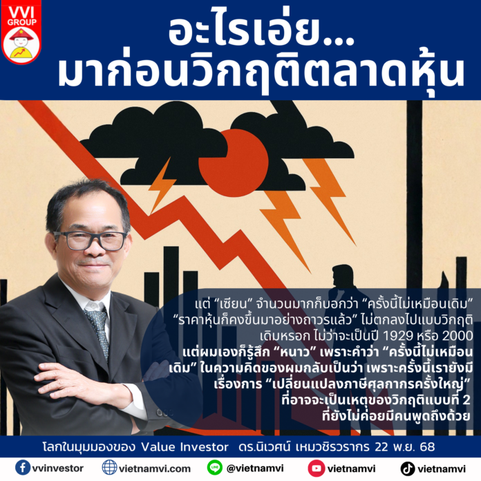 แต่ผมเองก็รู้สึก “หนาว” เพราะคำว่า  “ครั้งนี้ไม่เหมือนเดิม” ในความคิดของผมกลับเป็นว่า  เพราะครั้งนี้เรายังมีเรื่องการ  “เปลี่ยนแปลงภาษีศุลกากรครั้งใหญ่” ที่อาจจะเป็นเหตุของวิกฤติแบบที่ 2 ที่ยังไม่ค่อยมีคนพูดถึงด้วย
